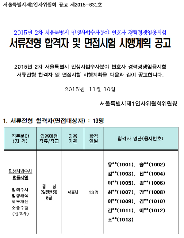 서류전형 합격자, 면접 안내 - 2015년 2차 서울특별시 민생사법수사분야 변호사 경력경쟁임용시험