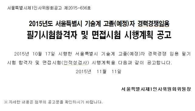 2015년 서울특별시 기술계 고졸(예정)자 경력경쟁임용 필기시험합격자 및 면접시험 시행계획 공고