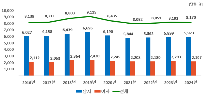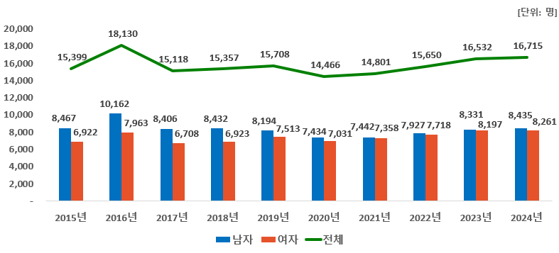 [그림 1] 2016-2024년 성별 중증외상1) 발생 추이 |