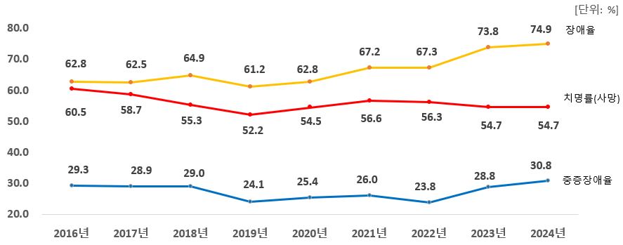 - 중증외상환자 치명률은 54.7%로 2016년(60.5%) 대비 감소, 생존자 중 장애율('16년 62.8%→'24년 74.9%), 중증장애율('16년 29.3%→'24년 30.8%) 지속적 증가