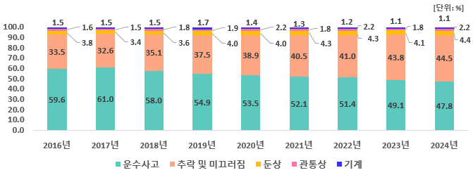 중증외상은 주로 운수사고(47.8%)와 추락·미끄러짐(44.5%)으로 인해 발생하였다. 운수사고의 비율은 감소('16년 59.6%→'24년 47.8%)한 반면, 추락·미끄러짐은 '16년 33.5%에서 '24년 44.5%로 지속적으로 증가하고 있다(그림 3 참고). 이러한 변화는 생활 환경과 고령 인구 증가 등 사회적 요인이 반영되었음을 예상할 수 있다.
