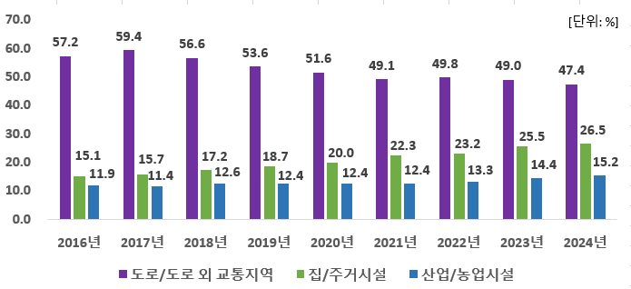 중증외상은 주로 도로 및 도로 외 교통지역('24년 47.4%)에서의 발생은 감소 추세를 보인 반면, 집·주거시설('24년 26.5%)에서의 발생은 증가 추세를 보이고 있다(그림 4 참조). 여전히 도로 및 도로 외 교통지역이 가장 높은 발생 비중을 차지하고 있으나, 중증외상이 발생하는 공간이 점차 일상생활 공간으로 확대되고 있는 것으로 나타났다.