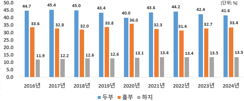 중증외상 발생 시 손상 부위는 주로 두부('24년 41.6%)와 흉부('24년 33.4%), 하지('24년 13.5%) 순으로 나타났다(그림 5 참조).