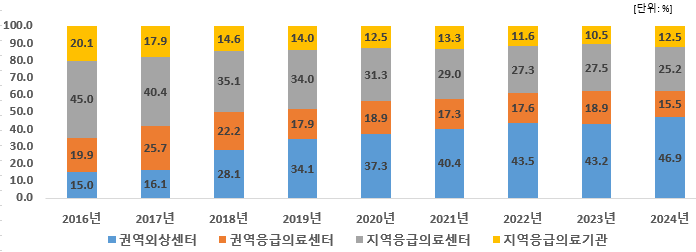 [그림 6] 2016-2024년 기관유형별1) 중증외상2) 발생 추이 |