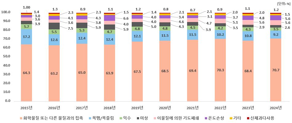[그림 10] 2015-2024년 연령별 화학물질 또는 다른 물질과의 접촉으로 인한 비외상성 중증손상1) 발생 추이 |