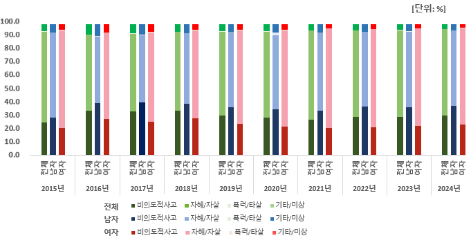 비외상성 중증손상은 매년 중독(화학물질 또는 다른 물질과의 접촉, '24년 70.7%)에 의해 가장 많이 발생하였고(그림 8 참조), 비외상성 중증손상을 의도성별로 나누어보면 자해/자살에 의한 경우('24년 65.6%)가 가장 많았다. 특히, 여성의 자해/자살이 2024년 73.4%로 여성의 비외상성 중증손상 중 자해/자살이 남성(57.5%)보다 많은 것으로 나타나 사회적 대책이 시급함을 알 수 있다(그림 9 참조).