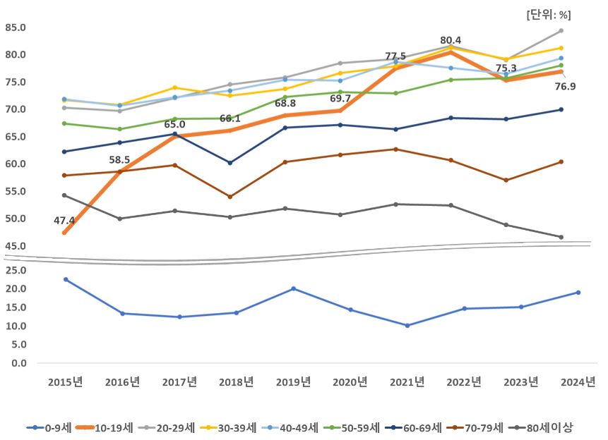 연령별로 살펴보면, 10대의 중독으로 인한 비외상성 중증손상이 2015년 47.4%에서 2024년 76.9%로 급격하게 증가하고 있음을 확인할 수 있다(그림 10 참조). 이는 청소년 대상 중독교육이 중요함을 시사한다. 질병관리청 중앙손상관리센터(고려대안암병원, 센터장 이성우 교수)는 청소년 중독 예방을 위해 2025년 찾아가는 청소년 의약품 오남용 예방교육을 실시한 바 있으며, 2026년에도 지속 추진할 계획이다.