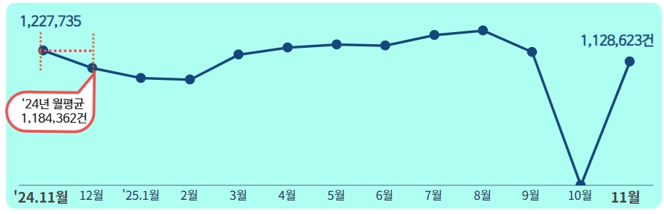 □ 11월 민원 발생량은 약 113만 건으로, 9월* 122만 건 대비 7.2% 감소하였으며, 전년도 11월(123만 건)과 비교 시 8.1% 감소했다.