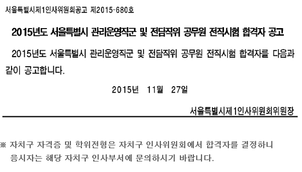 2015년도 관리운영직군 및 전담직위 공무원 전직시험 합격자 공고