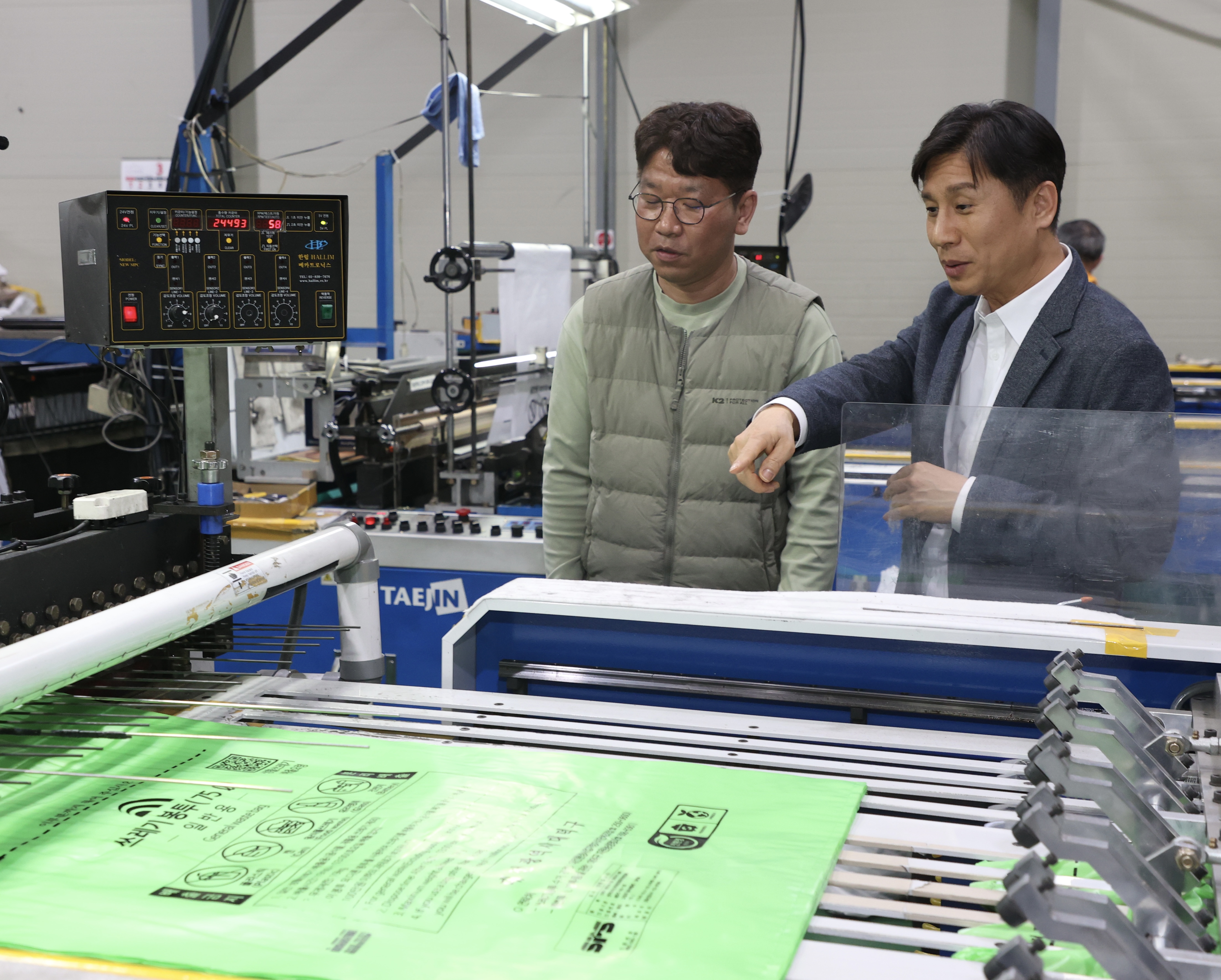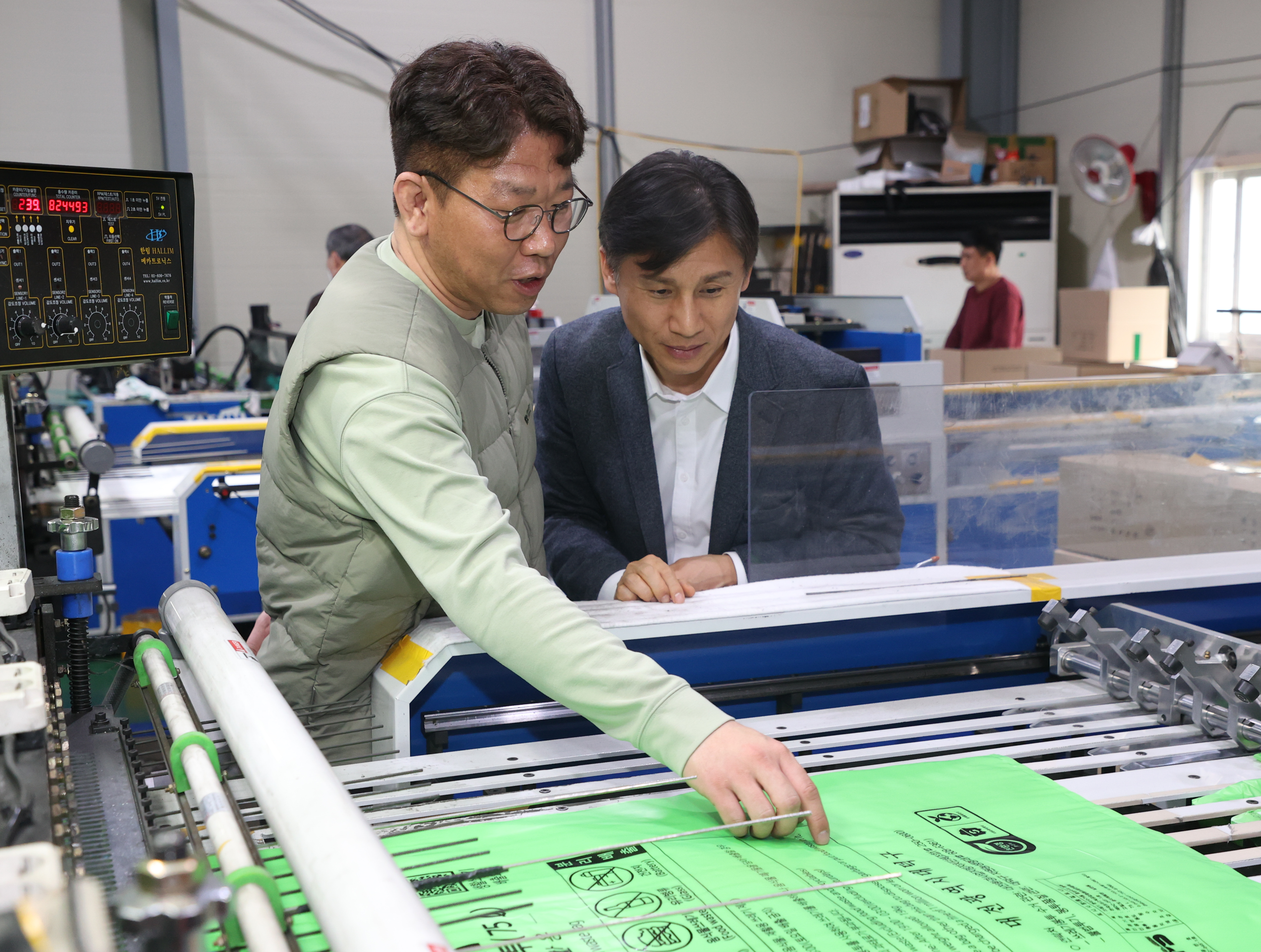 ▶ 백호성 구매사업국장(오른쪽)이 1일 충청남도 금산군 소재 종량제봉투 생산기업인 경승산업(대표 이승현)을 방문해 생산시설을 둘러보고 있다.