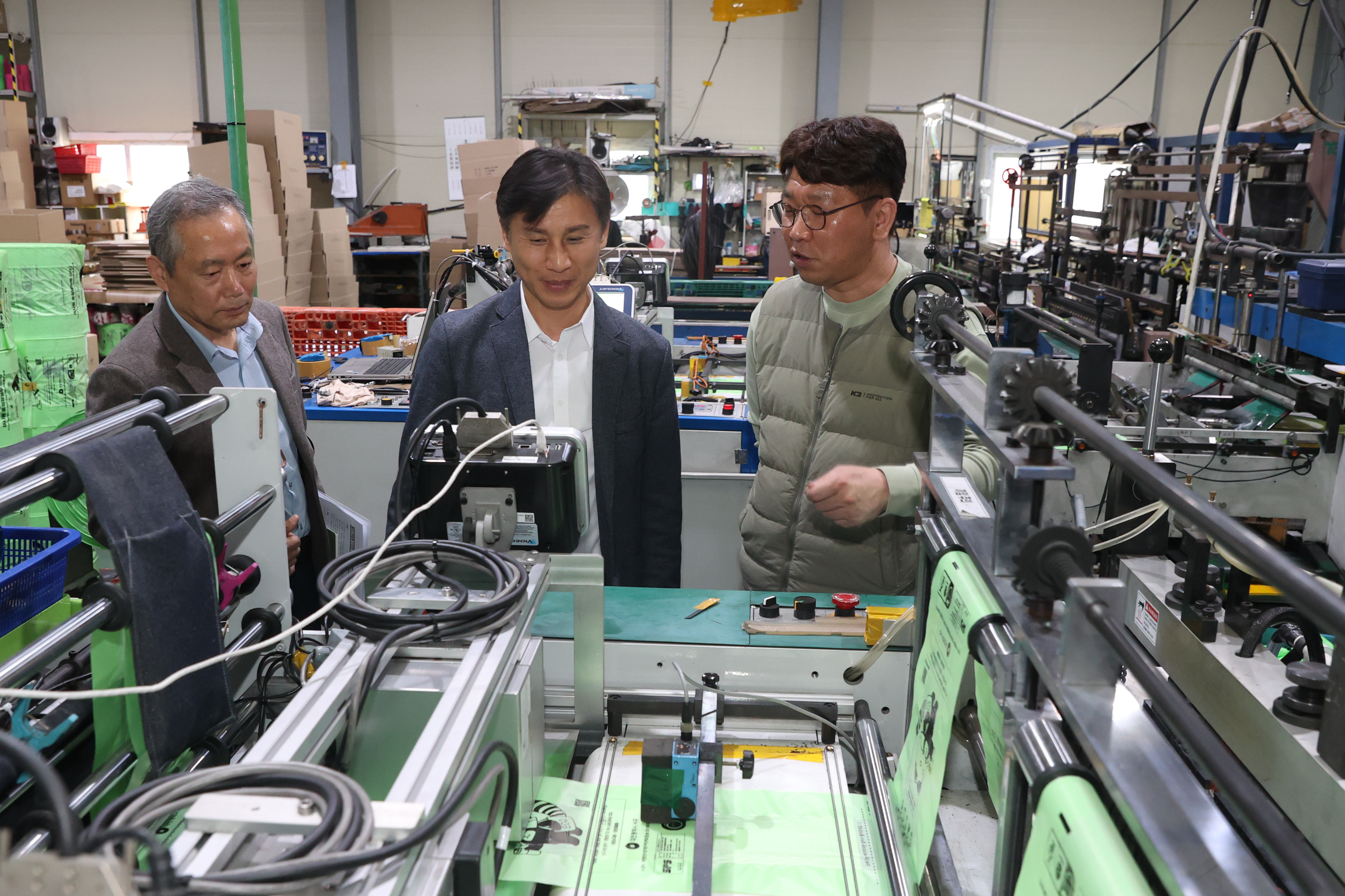 ▶ 백호성 구매사업국장(가운데)이 종량제봉투 생산기업인 경승산업을 방문해 생산 시설을 점검하고 원자재 수급 현황 등 현장의 목소리를 청취하고 있다.
