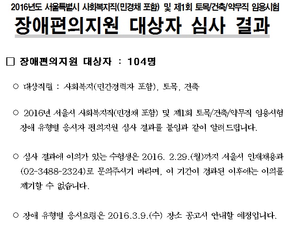 2016년도 서울특별시 사회복지직(민경채 포함) 및 제1회 토목/건축/약무직 임용시험 장애편의지원 대상자 심사 결과