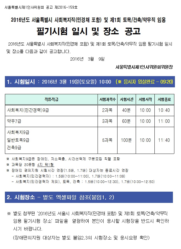 2016년도 서울특별시 사회복지직(민경채 포함) 및 제1회 토목/건축/약무직 임용 필기시험 일시 및 장소 공고