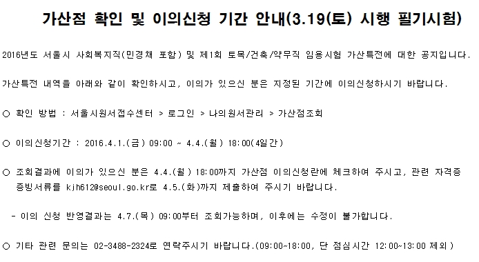 2016년도 서울시 사회복지직(민간경력 포함) 및 제1회 토목/건축/약무직 가산점 확인 및 이의신청 기간 안내