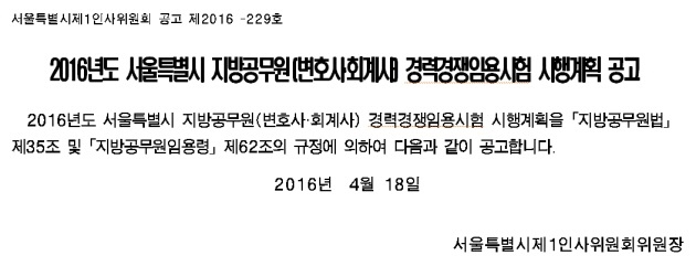 2016년도 서울특별시 지방공무원(변호사·회계사) 경력경쟁임용시험 시행계획 공고