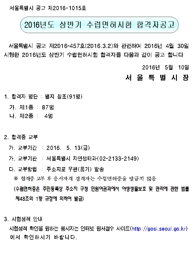 - 시험실시계획수립, 합격교부, 주소변경: 서울특별시 푸른도시국 자연생태과(02-2133-2149)