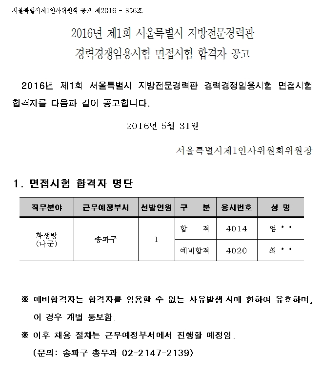 2016년 제1회 서울특별시 지방전문경력관 경력경쟁임용시험 면접시험 합격자 공고