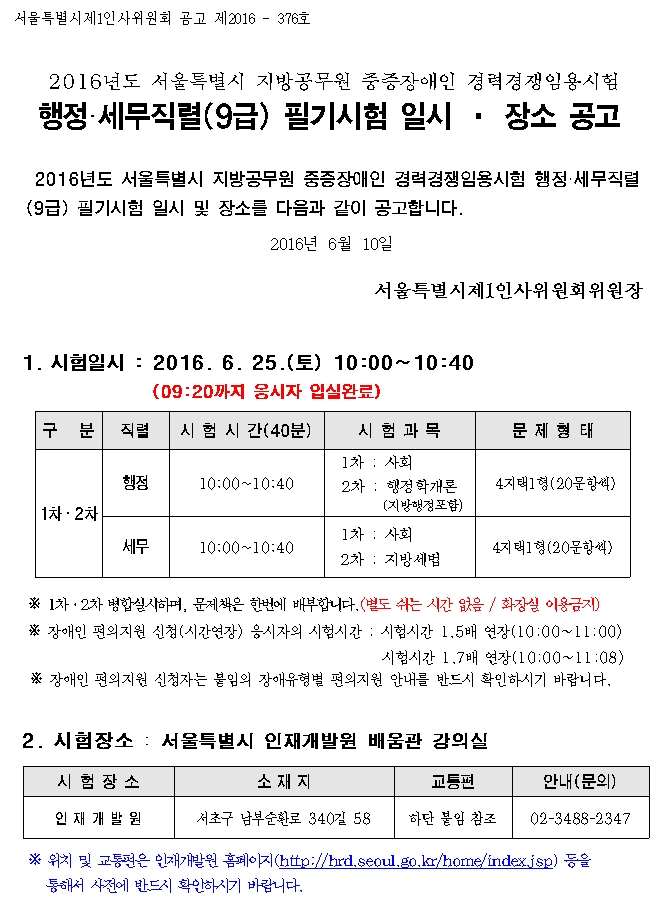 2016년도 서울특별시 지방공무원 중증장애인 경력경쟁임용시험 행정·세무직렬(9급) 필기시험 일시·장소 공고