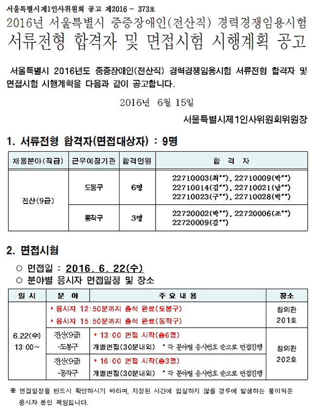 2016년 서울특별시 중증장애인(전산직) 경력경쟁임용시험 서류전형 합격자 및 면접시험 시행계획 공고