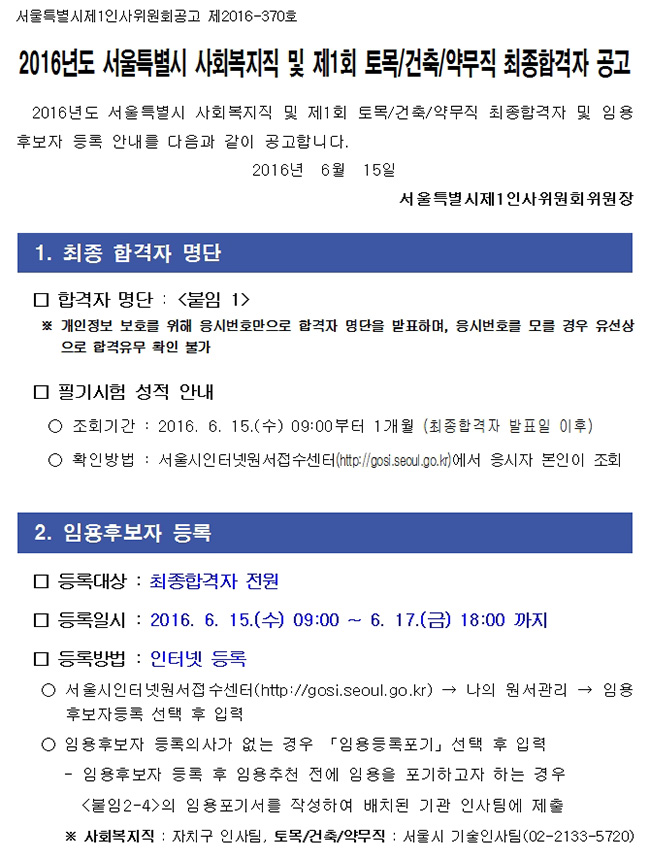 2016년 서울시 지방공무원 사회복지직 및 제1회 토목/건축/약무직 임용시험 최종합격자 공고