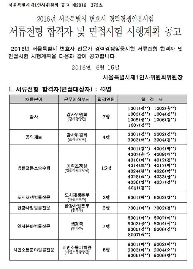 2016년 서울특별시 변호사 경력경쟁임용시험 서류전형 합격자 및 면접시험 시행계획 공고