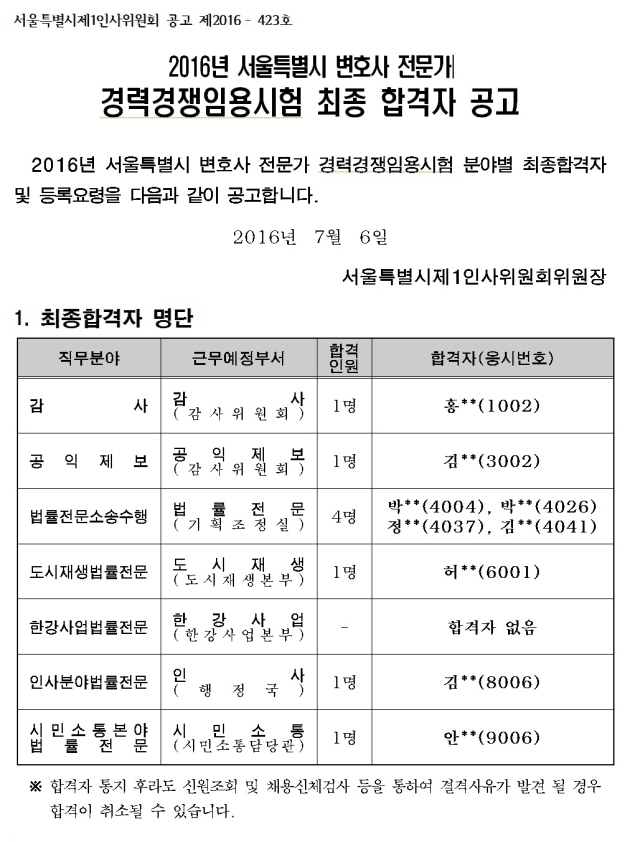 2016년 서울특별시 변호사 전문가 경력경쟁임용시험 최종합격자 공고
