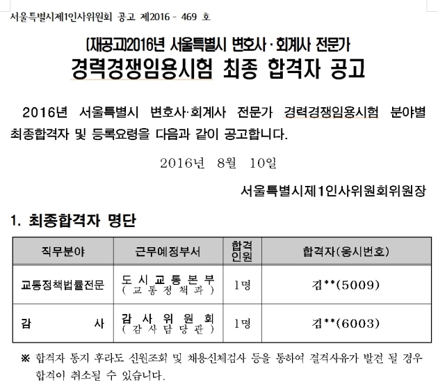 [재공고]2016년 서울특별시 변호사·회계사 전문가 경력경쟁임용시험 최종합격자 공고