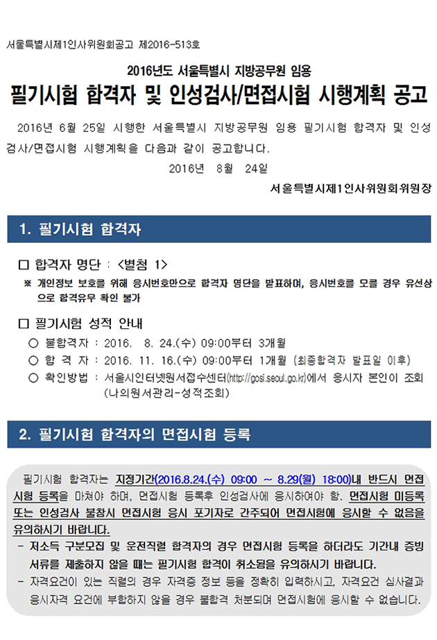 2016년도 서울특별시 지방공무원 임용 필기시험 합격자 및 인성검사/면접시험 시행계획 공고