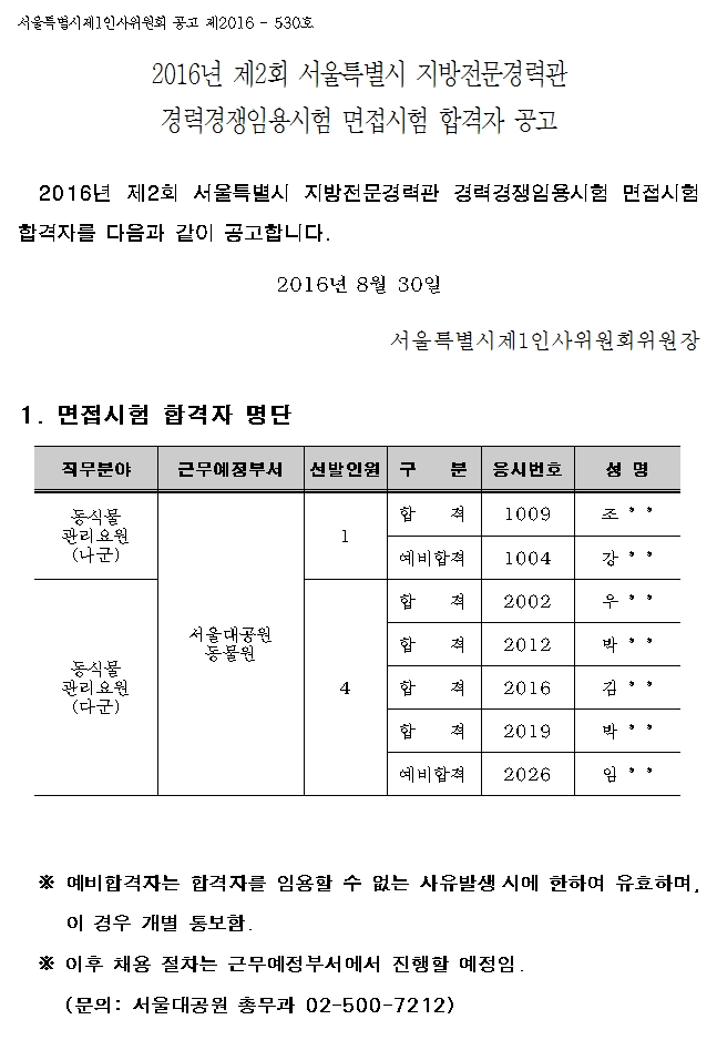 2016년 제2회 서울특별시 지방전문경력관 경력경쟁임용시험 면접시험 합격자 공고