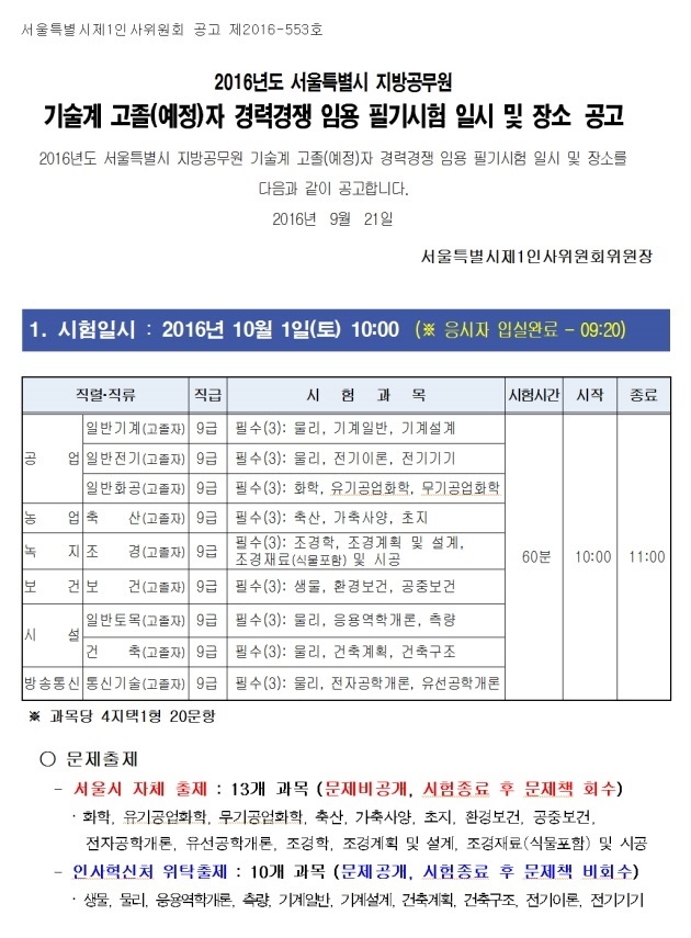 2016년도 서울특별시 지방공무원 기술계 고졸(예정)자 경력경쟁 임용 필기시험 일시 및 장소 공고