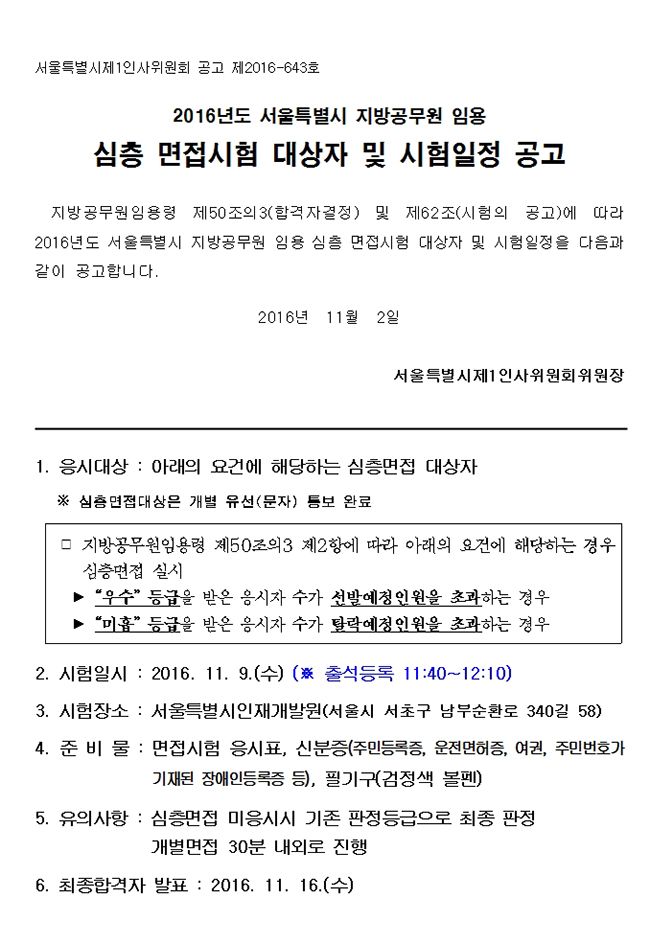 2016년도 서울특별시 지방공무원 임용 심층 면접시험 대상자 및 시험일정 공고