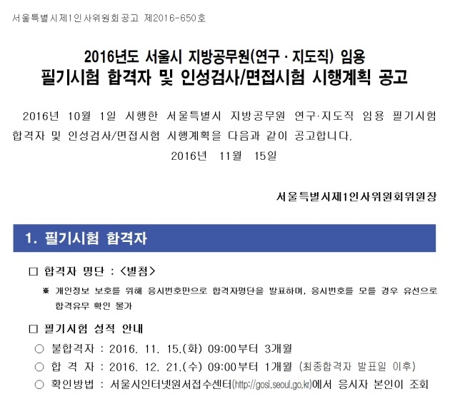 2016년도 서울시 지방공무원(연구·지도직) 임용 필기시험합격자 및 인성검사/면접시험 시행계획 공고