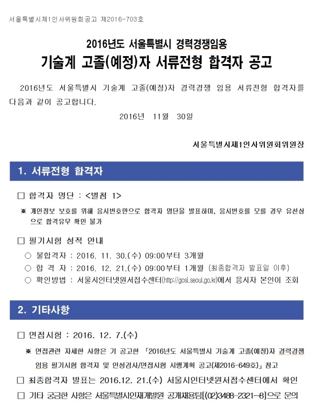 2016년도 서울특별시 경력경쟁임용 기술계 고졸(예정)자 서류전형 합격자 공고