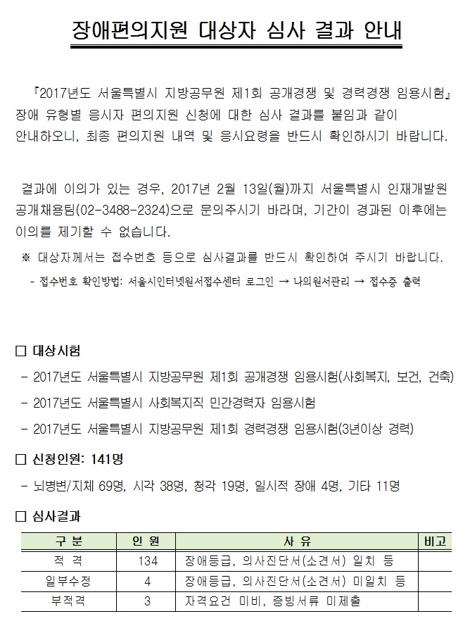 2017년도 서울특별시 지방공무원 제1회 공개경쟁 및 경력경쟁 임용시험 장애편의지원 대상자 심사 결과 안내