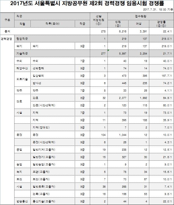2017년도 서울특별시 지방공무원 제2회 경력경쟁 임용시험 경쟁률(최종, 7.31.(월) 18:00현재)