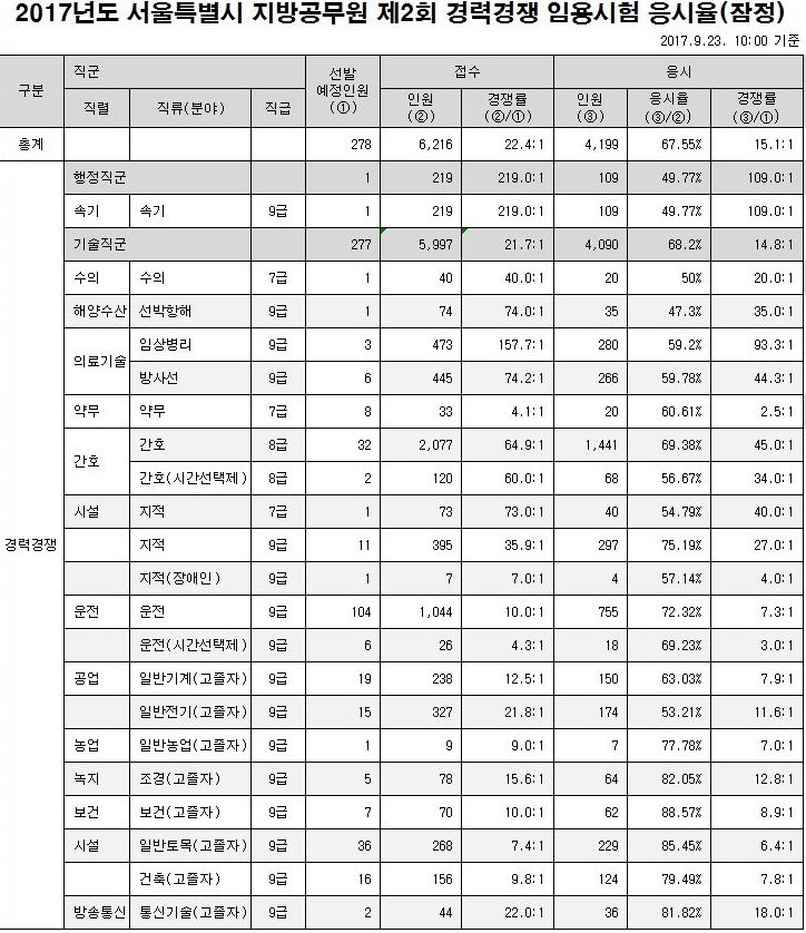 2017년도 서울특별시 지방공무원 제2회 경력경쟁 임용시험 응시율(잠정)