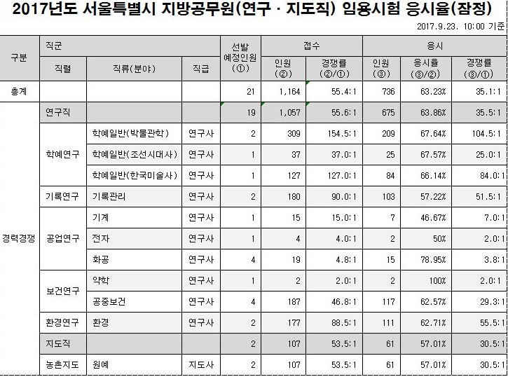 2017년도 서울특별시 지방공무원(연구·지도직) 임용시험 응시율(잠정)