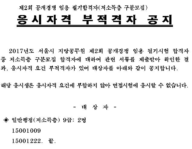 2017년도 서울특별시 지방공무원 제2회 공개경쟁 임용 필기합격자 응시자격 부적격자(저소득층 구분모집) 공지