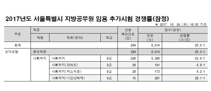 2017년도 서울특별시 지방공무원 공개경쟁 임용 추가시험 경쟁률(잠정)