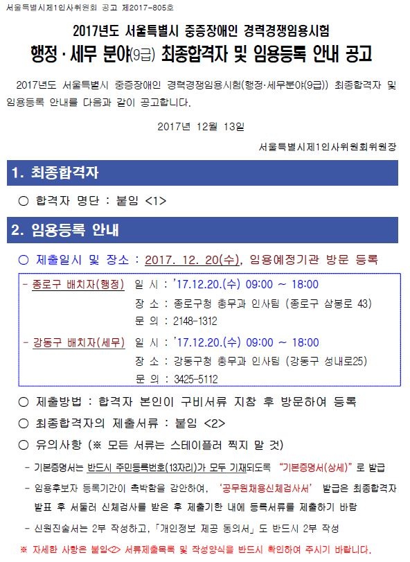 2017년도 서울특별시 중증장애인 경력경쟁 임용시험 행정·세무 분야(9급) 최종합격자 및 임용등록 안내 공고