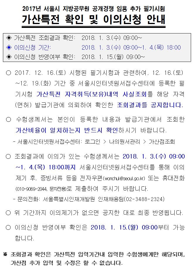 2017년 서울시 지방공무원 공개경쟁 임용 추가 필기시험 가산특전 확인 및 이의신청 안내