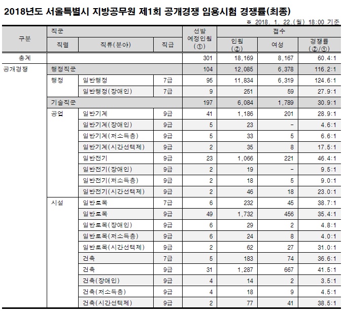 2018년도 서울특별시 지방공무원 제1회 공개경쟁 임용시험 경쟁률(최종)