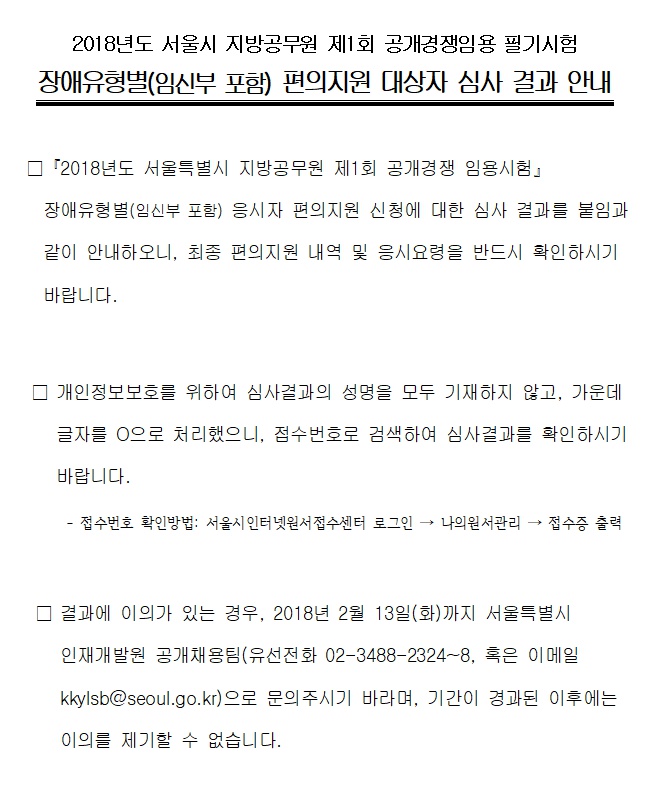 2018년도 서울시 지방공무원 제1회 공개경쟁임용 필기시험 장애유형별(임신부 포함) 편의지원 대상자 심사 결과 안내