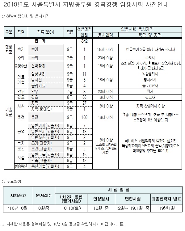 2018년도 서울특별시 지방공무원 경력경쟁 임용시험 사전안내